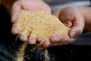 L'aliment est fabriqué sur l'exploitation à partir des céréales produites ou achetées localement à la récolte. Nous y ajoutons 6% de graines de lin extrudées afin d'augmenter la teneur en oméga 3 de nos produits, ainsi que 4% d'un complément minéral nécessaire au bon développement de l'animal.